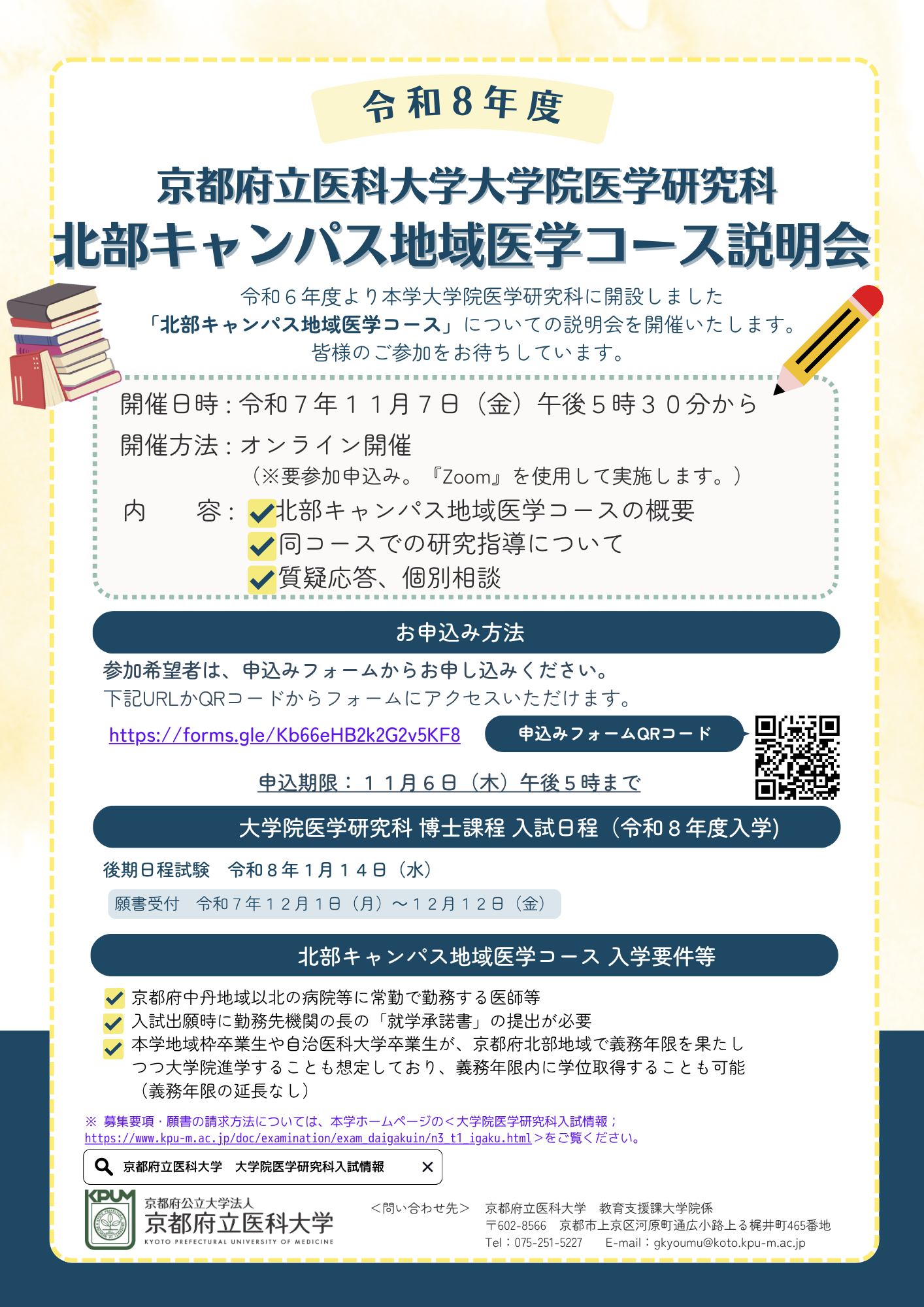 令和6年度より開設しました「北部キャンパス地域医学コース(博士課程)」についての説明会を開催します。説明会への参加は申込みが必要ですので、参加をご希望の方は、下記より申込みをお願いします。