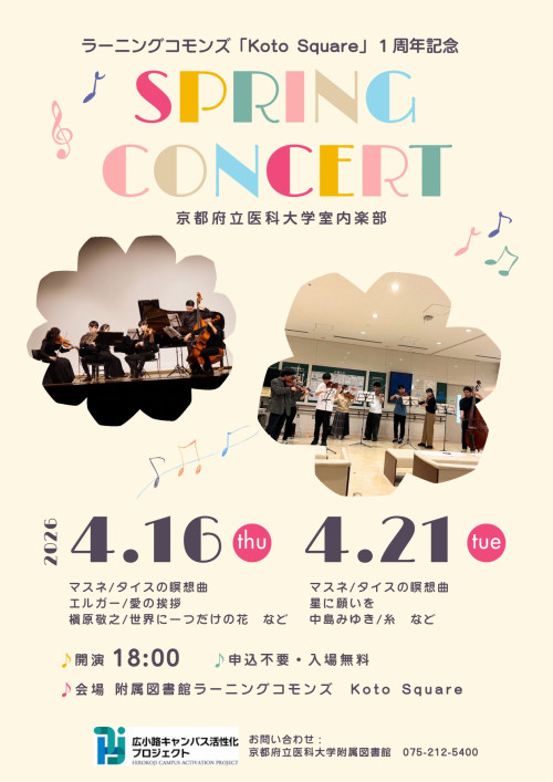 京都府立医科大学附属図書館では、「広小路キャンパス活性化プロジェクト」の一環として、教育研究交流施設「Koto Square」の開設1周年を記念し、「室内楽コンサート」を開催いたしますので、お知らせいたします。