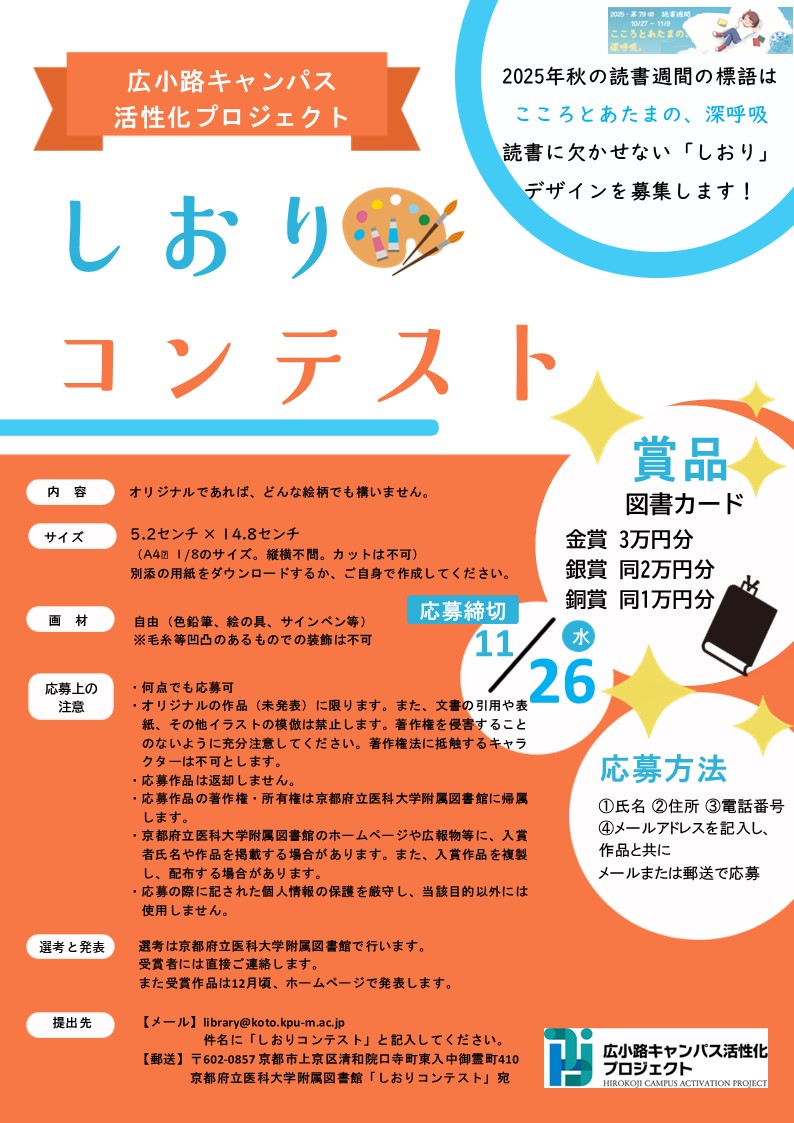 秋の読書週間、初企画!京都府立医科大学の写真、動画を募ります。詳しくはこちら。Koto Squareや旧附属図書館棟など、府立医大のフォトジェニックな風景を素敵に撮影してください!